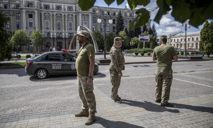 Các sĩ quan TCC tuần tra trên đường ở thành phố Kharkov hồi tháng 8. Ảnh: AFP